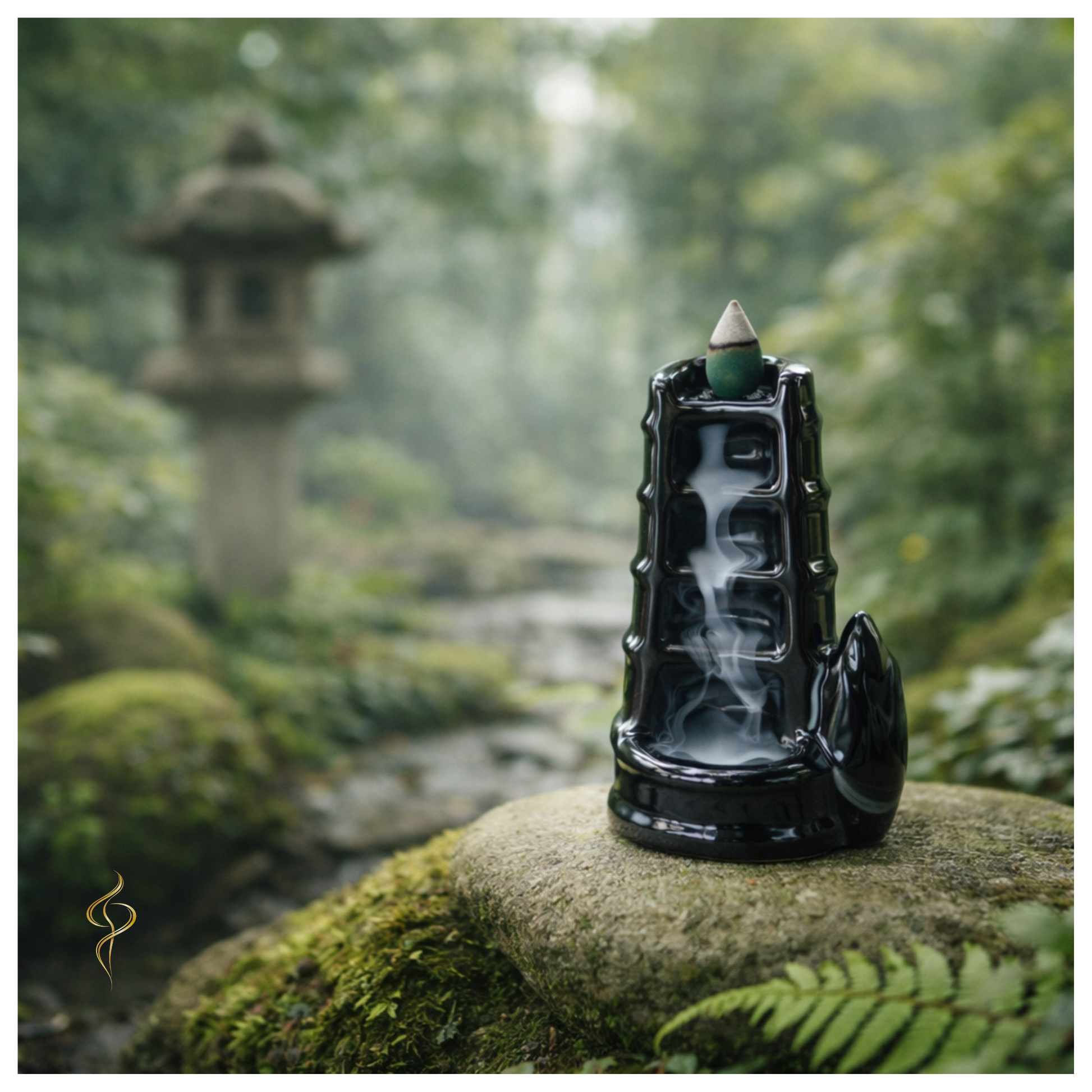 Une fois le cône d’encens à reflux allumé et positionné au sommet, la fumée descend lentement le long des ouvertures successives, rappelant le clapotis doux de l’eau sur le bambou fendu. Chaque palier accompagne le mouvement, offrant une observation lente et hypnotique.