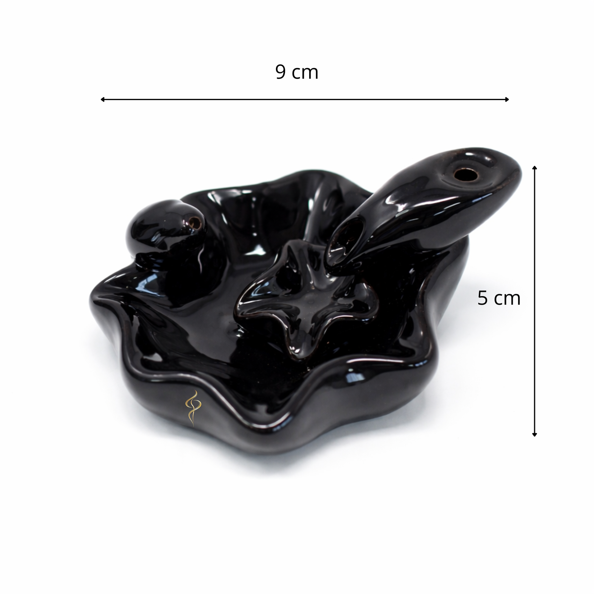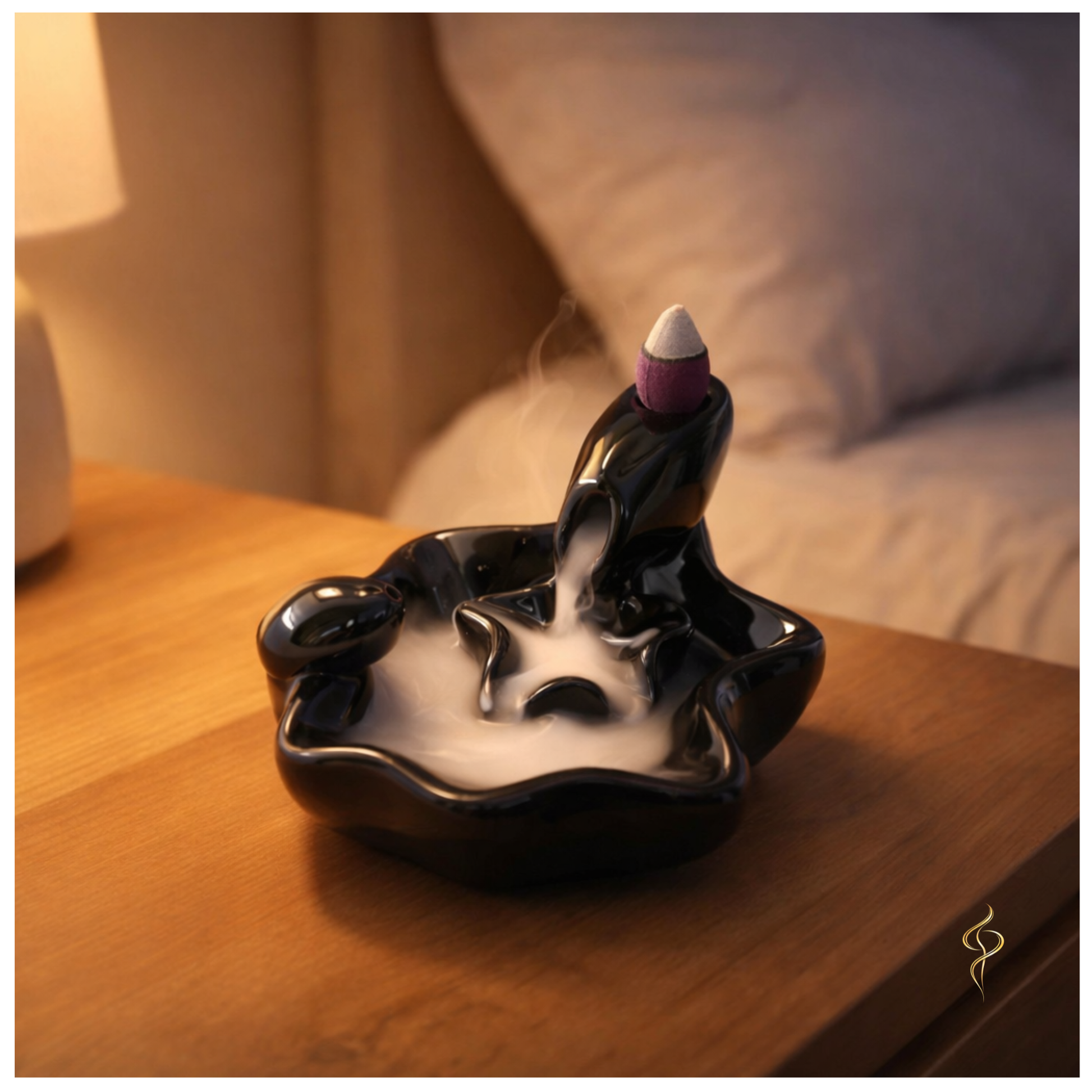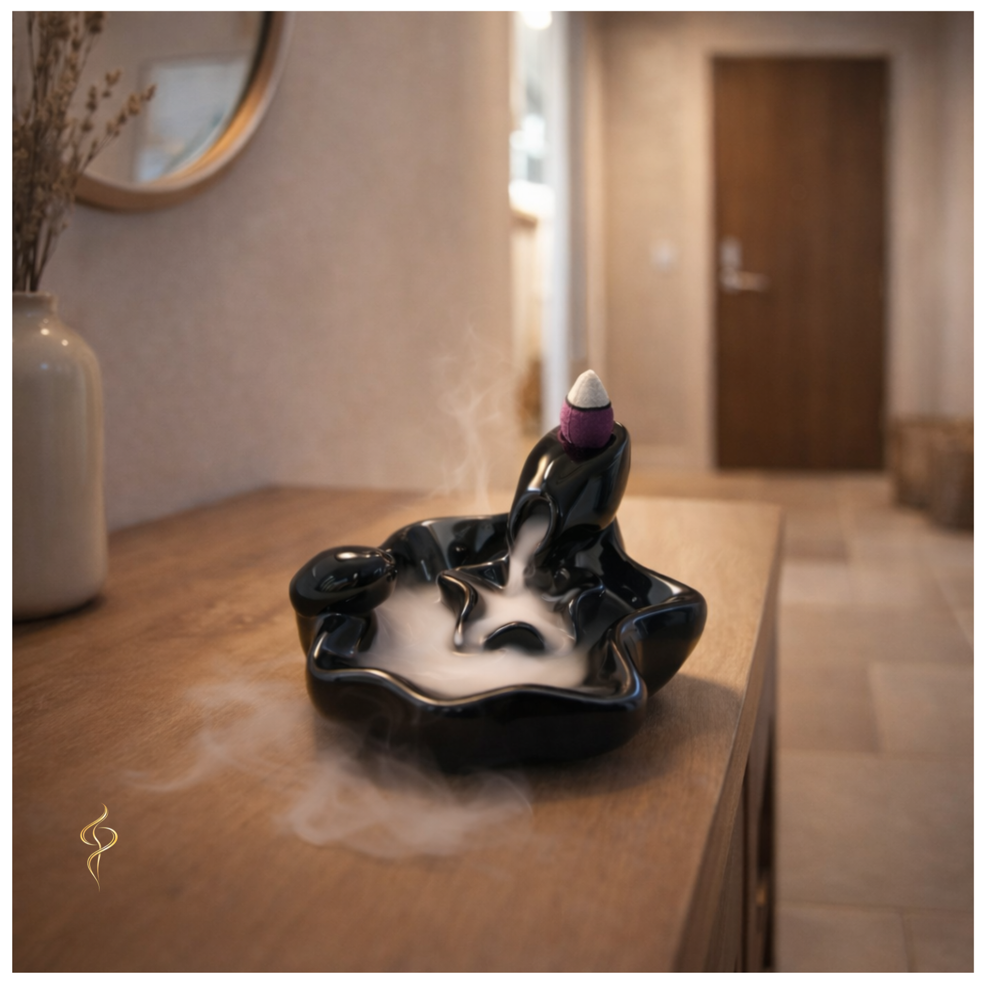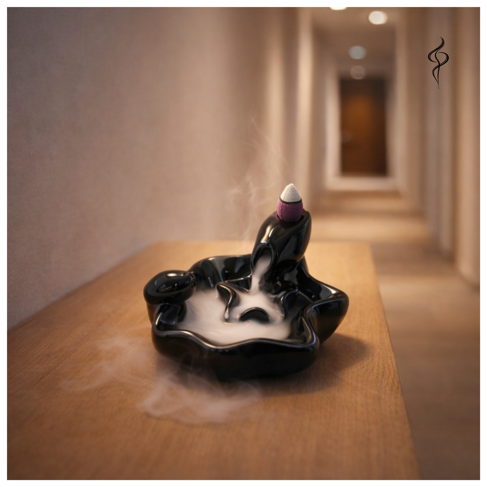 Une fois le cône d’encens à reflux allumé et placé sur l’orifice supérieur, la fumée descend progressivement d’une vasque à l’autre. Chaque “piscine” accueille la fumée avant de la laisser s’écouler vers la suivante, créant un mouvement continu et relaxant.